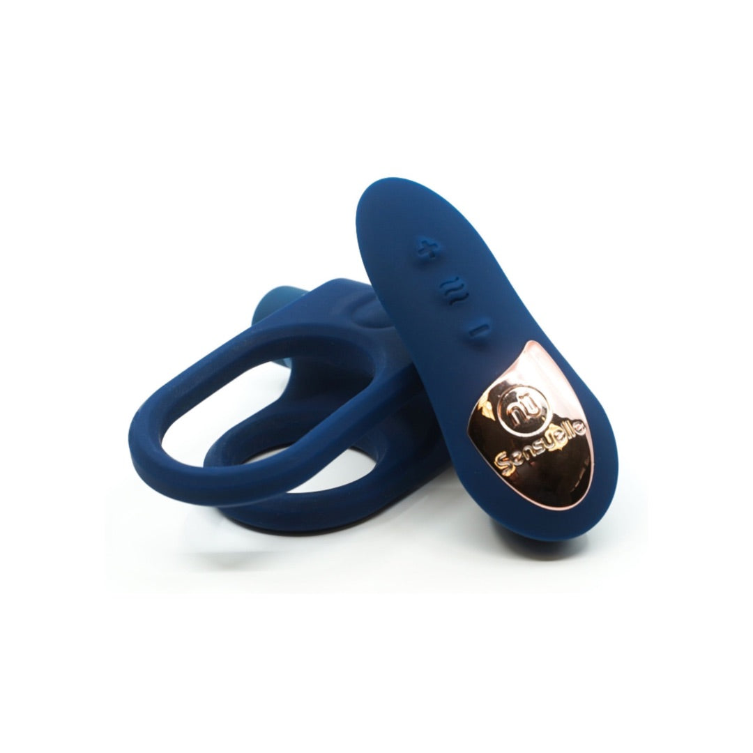 Nu Toys for adults Sensuelle Remote Control Ring Navy Blue features 15 functions. Studded double cock ring. One smooth outer ring and one studded ring and a studded sleeve for stimulation for her. Rechargeable.
